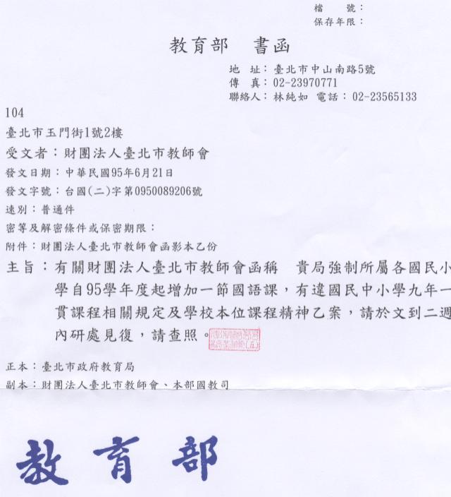 針對教育局強制各校於下學年度起每週增加一節國語課一事,教育部業已行文教育局要求「文到二週內研處見復」(發文日期:95年6月21日,本會收文日期6月23日)。